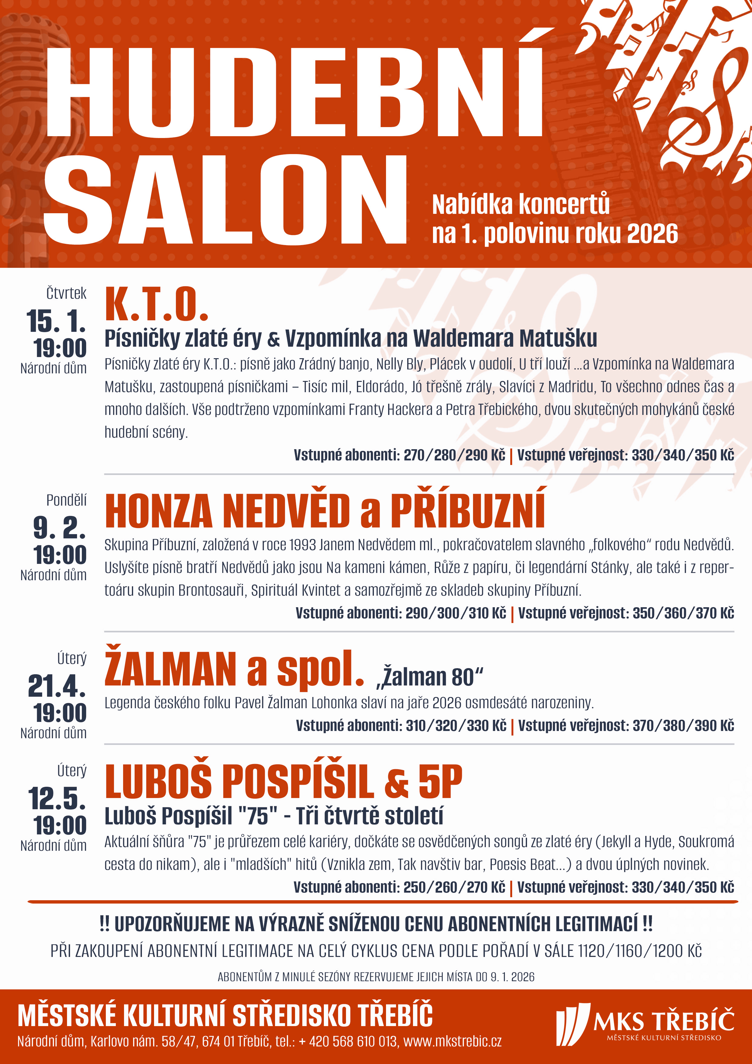 Abonentní legitimace si můžete zakoupit od 8. 12. 2025 u pokladny Národního domu, Karlovo nám. 58/47 v Třebíči – tel: +420 568 610 013.